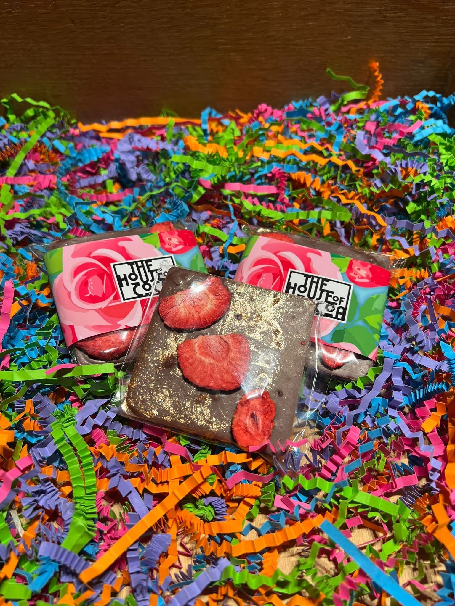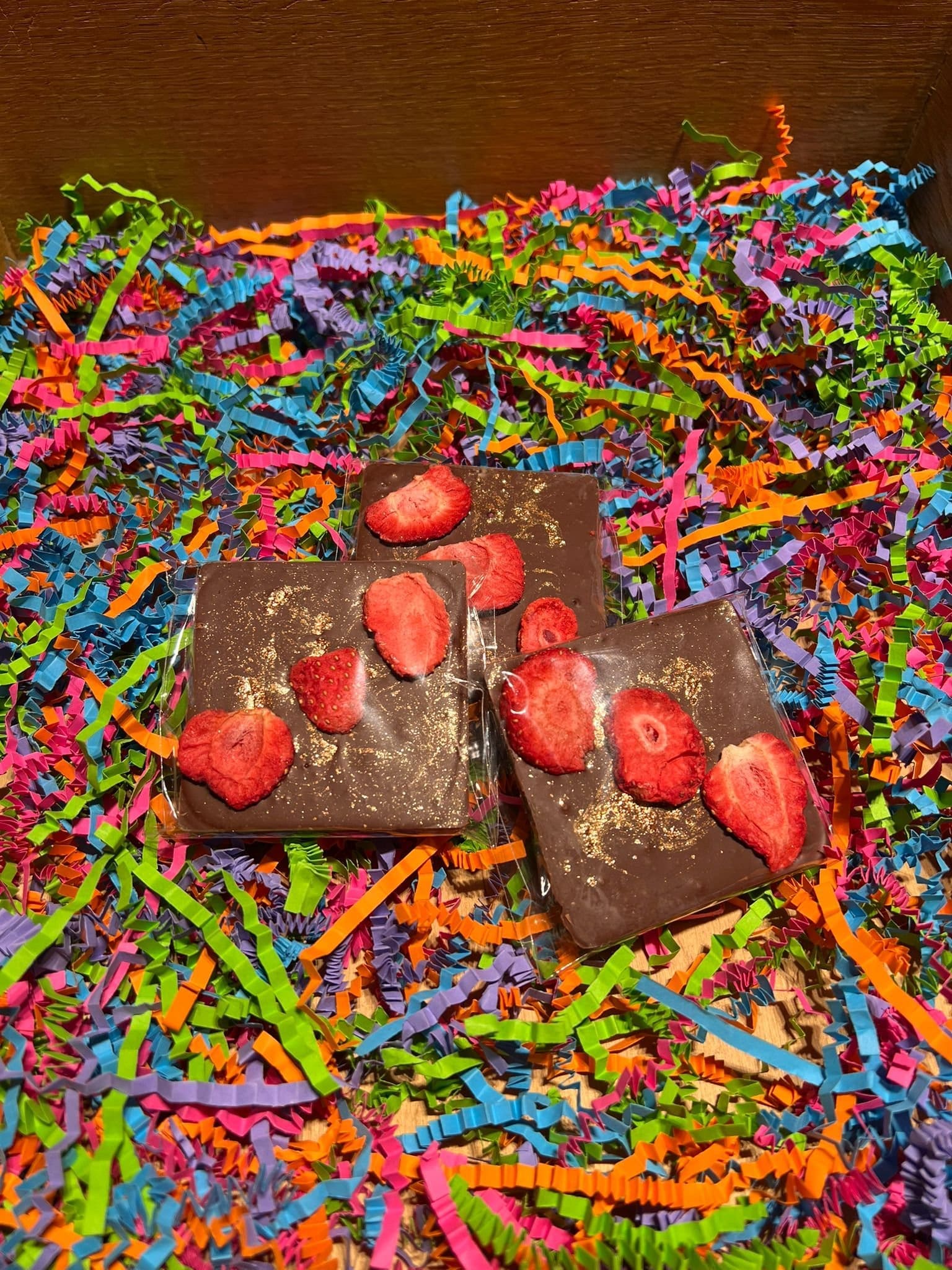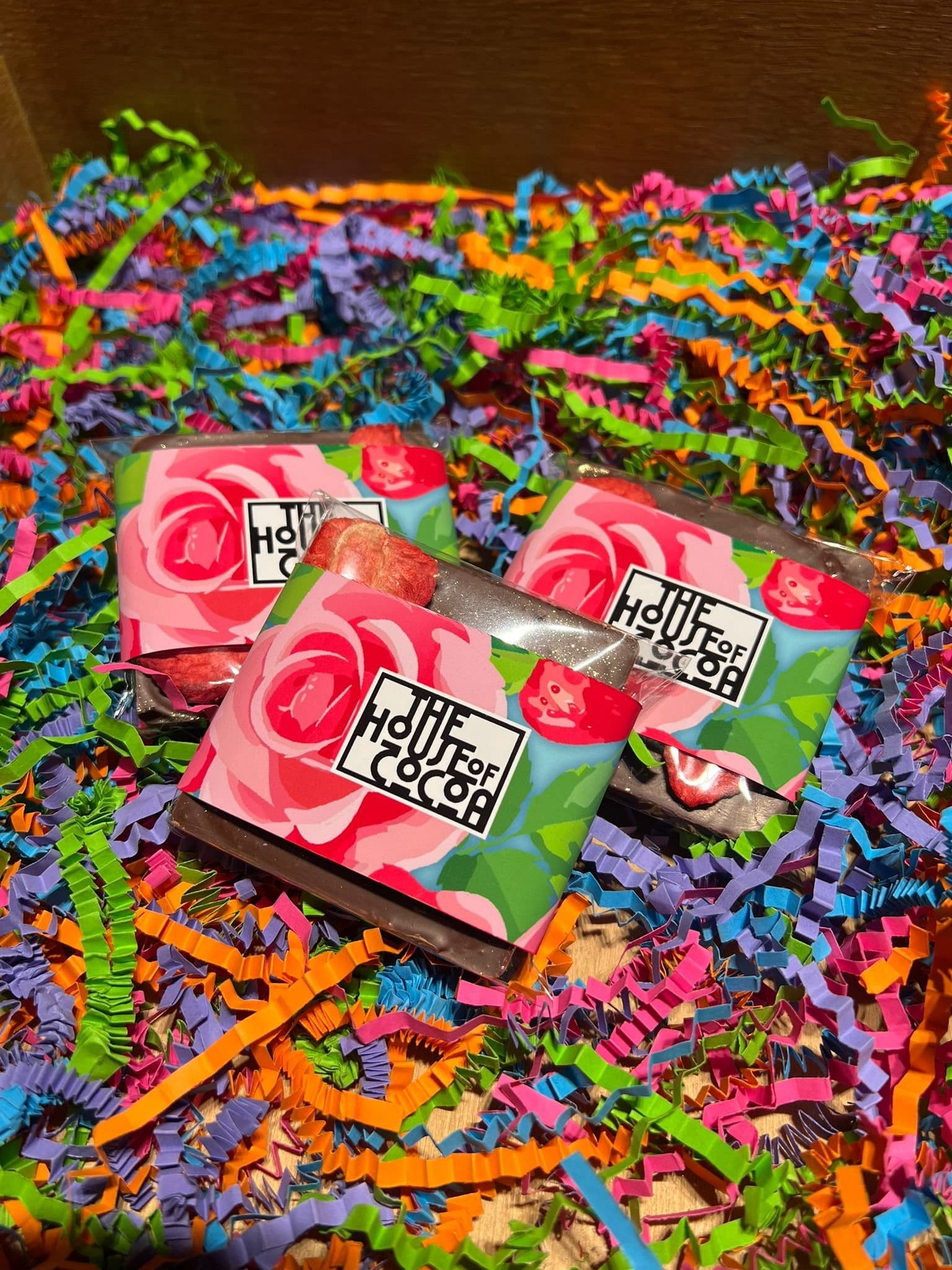 Ingredients: Milk Chocolate (45%) (sugar, cocoa butter, cocoa mass, whole milk powder, natural vanilla), Rose petal powder, iron oxide E172, freeze dried strawberry slices.