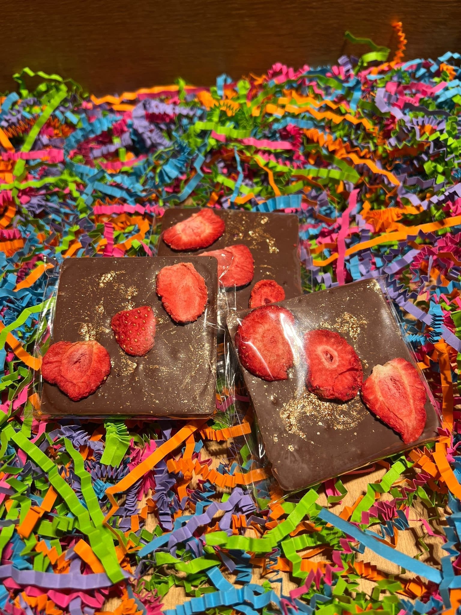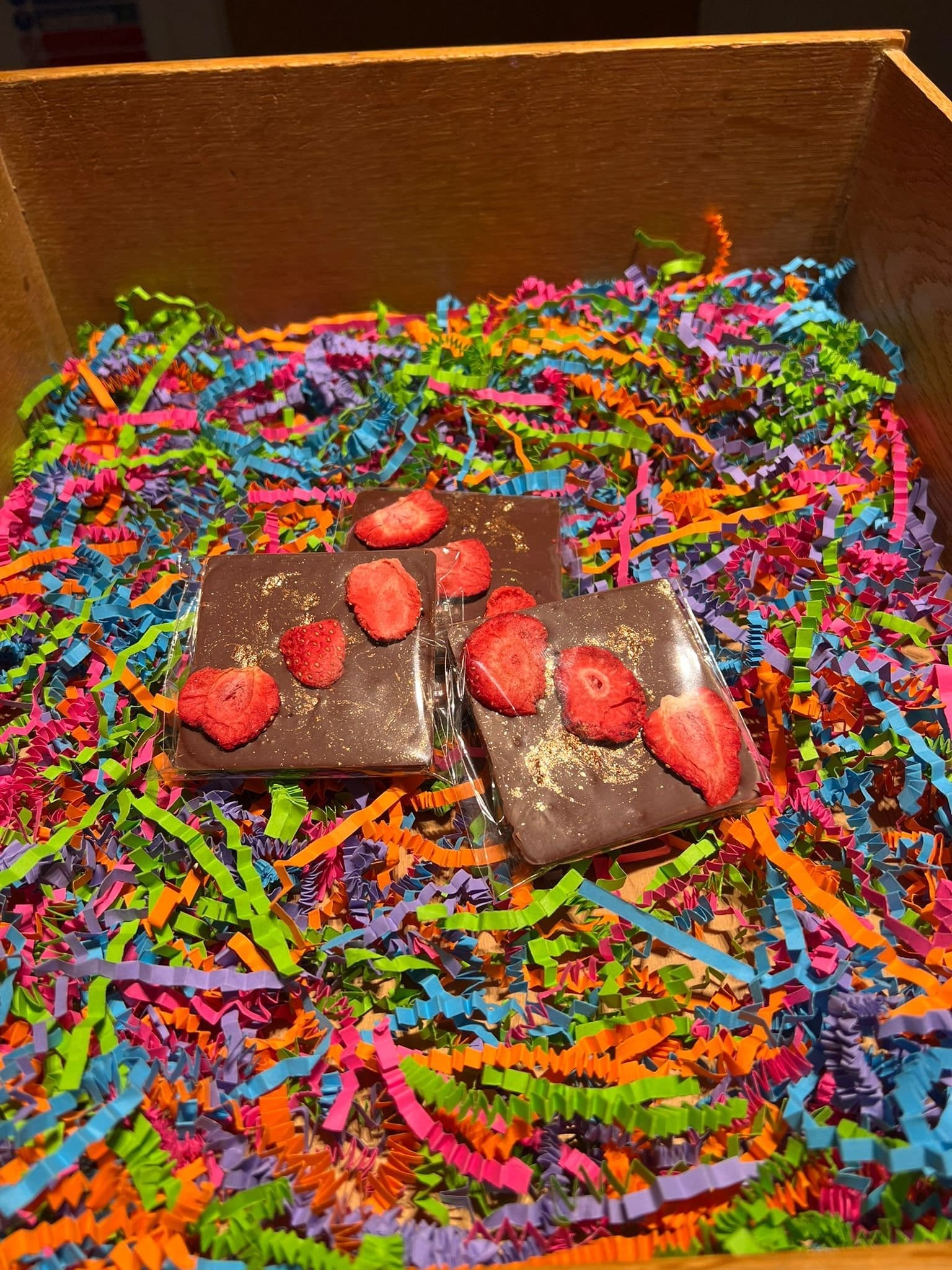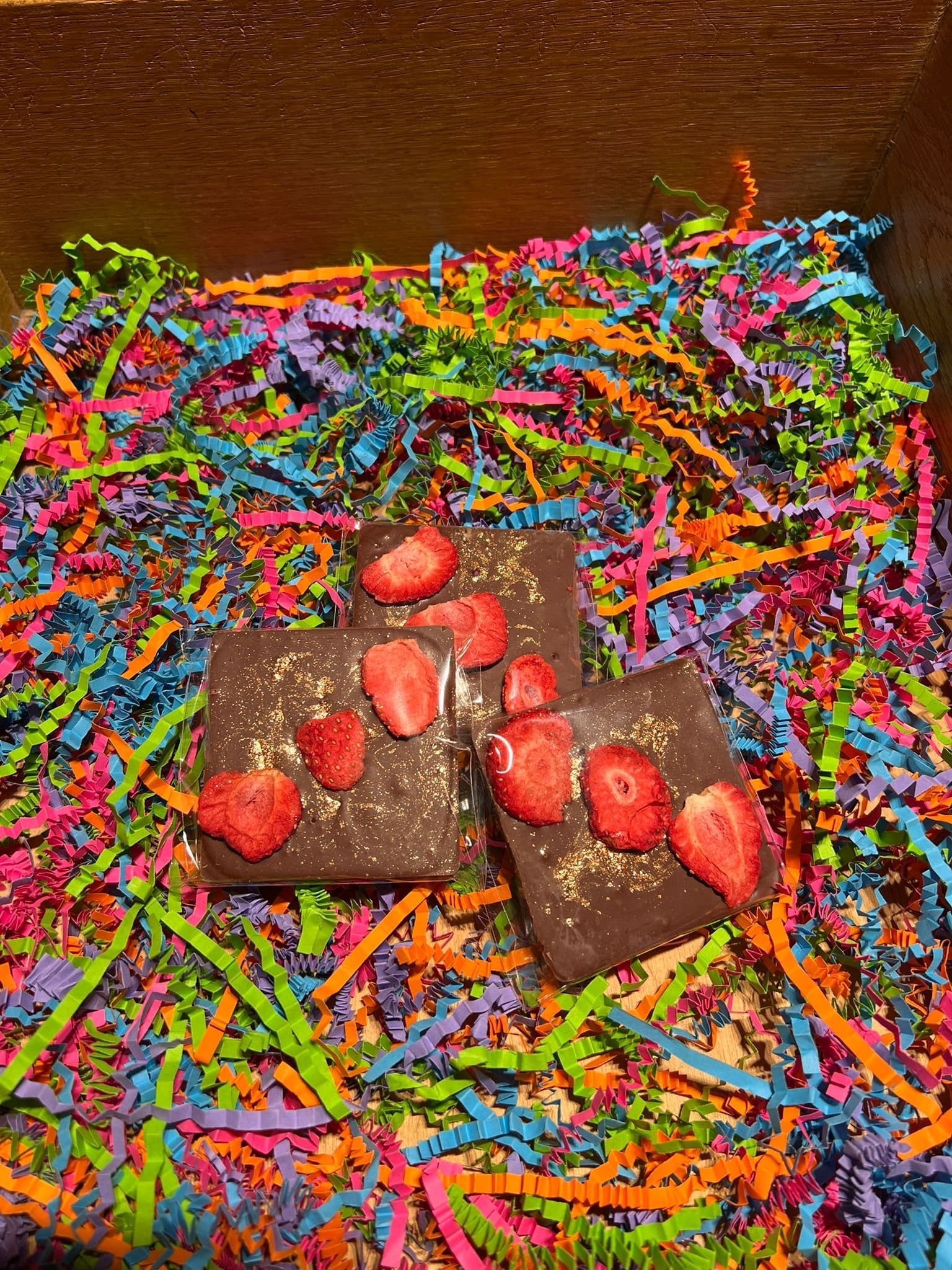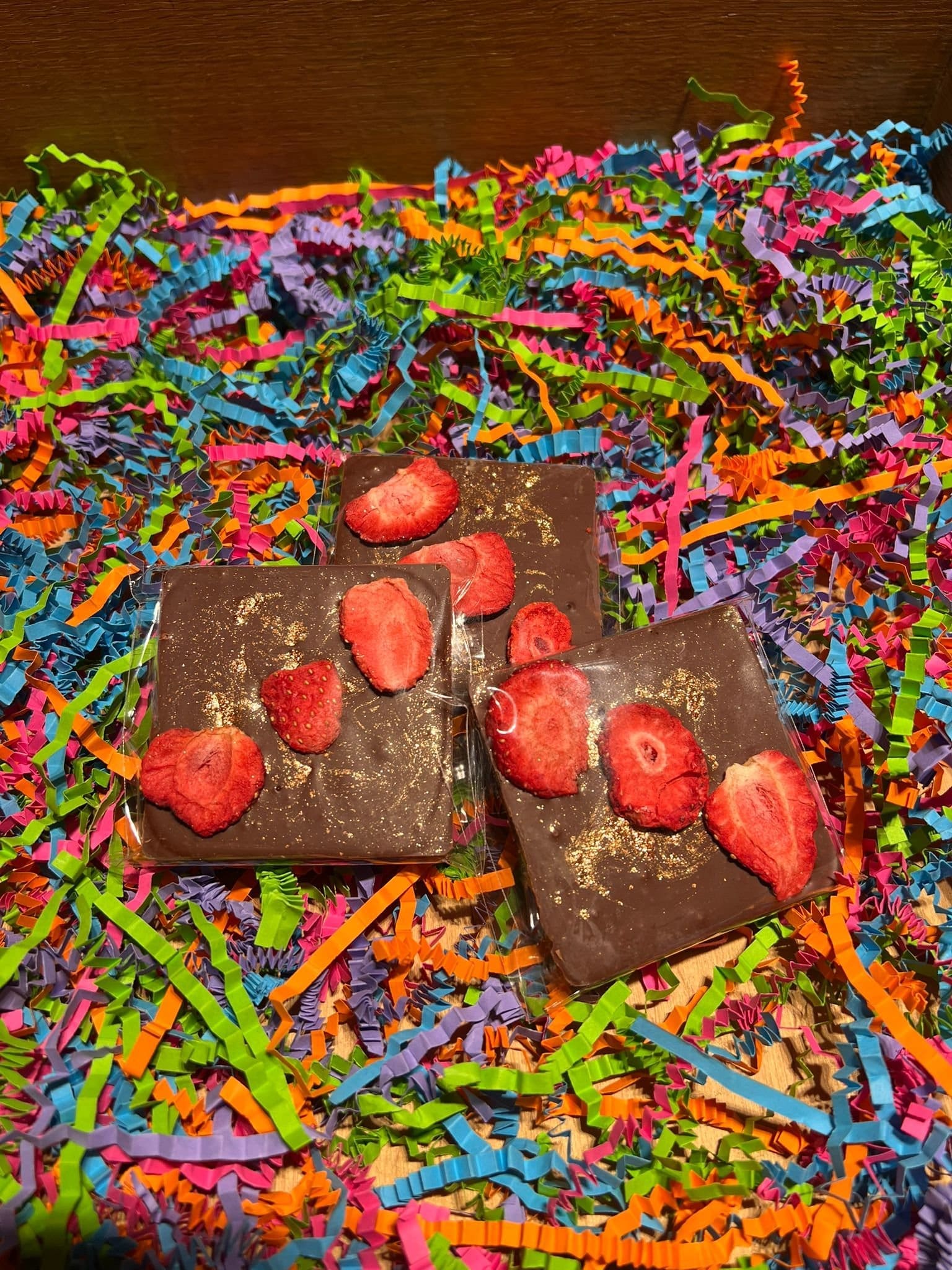 Ingredients: Milk Chocolate (45%) (sugar, cocoa butter, cocoa mass, whole milk powder, natural vanilla), Rose petal powder, iron oxide E172, freeze dried strawberry slices.