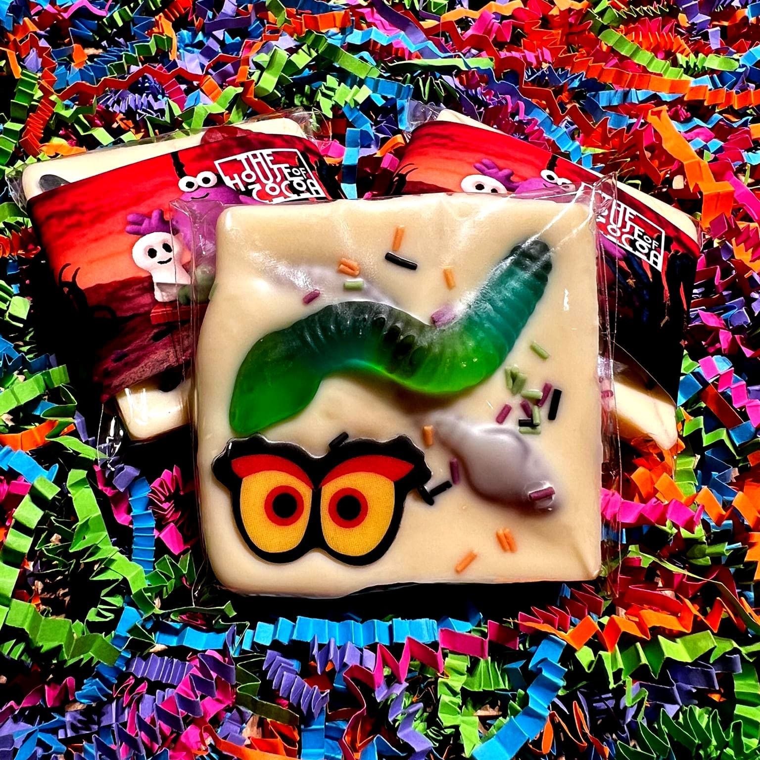 Meet our White Chocolate Bar with Worms, Eyes and sprinkles, an edible tribute to the hilarious horrors beneath the castle. This creamy, luxurious white chocolate slab is the perfect canvas for a truly monstrous gathering of toppings. Each bar features a wonderfully wiggly gummy worm, glaring, googly edible eyes, and a generous shower of bright, playful sprinkles.